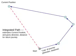 L'intégration de chemin est donc un processus dynamique de mémorisation spatiale de l'environnement qui permet de corriger les erreurs accumulées lors du trajet tout en connaissant la distance et la direction de son point de départ. Pour revenir à son point de départ, l'animal n'a pas nécessairement besoin de mémoriser l'ensemble du trajet parcouru, ni même de retenir les points d’arrêts effectués. Ainsi, les seules données enregistrées par l'animal sont celle de son emplacement courant et celle de son point de départ, qui au cours de son trajet sont continuellement réactualisées[13].