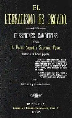 Aucune œuvre ne servit d’exposé systématique officiel ou semi-officiel de la doctrine intégriste ; son corpus théorique fut principalement diffusé à travers des articles de presse[122], celui dénommé « Manifestación de Burgos » étant le plus fréquemment cité[123], [124]. Ce qui se rapprocha le plus d’un manuel idéologique est Le libéralisme est un péché (« El liberalismo es pecado »), un opuscule publié en 1884 par Félix Sardá y Salvany[125]. Il s’agissait d’une exposition des enseignements papaux sur le libéralisme, mais présentée sous une forme absolue et intransigeante. Sardá soutenait que, puisque le libéralisme était une hérésie pécheresse, chaque catholique était tenu de le combattre ; « l’on n'est pas intégralement catholique à moins d'être intégralement anti-libéral »[126]. Le livre définit immédiatement le groupe comme un mouvement militant ouvertement anti-libéral cherchant à réintroduire l'unité religieuse dans les objectifs politiques.