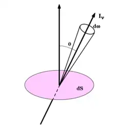 où θ représente l'angle entre la normale à la surface dA considérée et la direction de l'angle solide dω. La présence du facteur cos θ est motivée par le fait que la portion de rayonnement qui traverse effectivement la surface considérée est déterminée par la projection de cette surface perpendiculairement à la direction du rayonnement, projection qui vaut dA cos θ. Avec cette définition, Iν ne dépend de l'orientation de la surface que par le facteur cos θ. En particulier, un rayonnement isotrope se caractérise par un Iν constant.