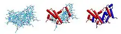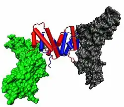 Le dimère biologiquement actif est formé par l'emboîtement antiparallèle des deux monomères comme indiqué ci-contre à droite. Dans le modèle de dessin animé, un monomère est représenté en rouge, l'autre en bleu.