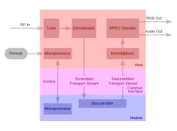 La norme « interface commune » spécifie les moyens de communication entre les modules (CAM) et les récepteurs construit pour lire et désembrouiller les signaux DVB.