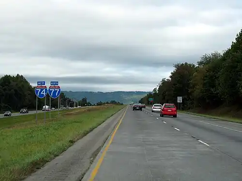 Frontière Caroline du Nord–Virginie 105,7 170,1 I-77 nord – Wytheville (VA), Roanoke (VA) Extrémité nord de l'Interstate 77 en Caroline du Nord; Terminus nord provisoire de la partie Sud-Est de l'Interstate 74