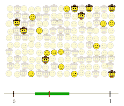 Autrement dit, le sondage produit une estimation f (la proportion observée) et il y a (au moins) 95 % de chances que la vraie valeur p soit dans l'intervalle de confiance . Dans cette formulation simple, on voit, pour un niveau de confiance fixé (ici 95 %), quand le nombre n de personnes sondées augmente, alors l'intervalle de confiance se resserre autour de f . Avant de construire l'intervalle de confiance, construisons un intervalle de fluctuation.
