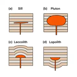 Selon la profondeur de formation et la géométrie, l'intrusion du magma peut être classée comme plutons, filons-couches ou sill, laccolithes, phacolithes et lopolites.