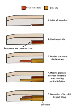 La formation du laccolite dépend des joints et des failles des roches encaissantes au début de l'intrusion[30]. La rupture de ces lignes de faiblesse permet la formation de structures initiales en forme de sill, de forme horizontale[30]. À ce stade, l'intrusion tabulaire (en nappe) est le mécanisme plus facile car les marges de la nappe se refroidissent plus rapidement, ce qui crée des zones de cisaillement permettant un déplacement horizontal supplémentaire[31]. Après un certain temps, alors que le taux de refroidissement diminue et que les filons-couches continuent de s'empiler les uns sur les autres, l'intrusion en nappe ne fonctionne plus car les zones de faiblesse diminuent[31]. La cohésion entre les couches sédimentaires est prise en défaut également en raison des déplacements et des déformations de la roche[30]. Ici, l'inflation est un mécanisme possible pour poursuivre la croissance des intrusions. Si, à ce stade, la surface du magma est suffisamment grande pour générer une force magmatique capable de vaincre la charge lithostatique de la couche sus-jacente, un gonflement vertical peut avoir lieu[30]. Le gonflement vertical des chambres magmatiques crée des laccolithes[30].