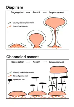 Un diapir se forme lorsqu'une boule de matière, une goutte chaude et ductile, remonte vers une couche lithosphérique supérieure[13]. Le diapirisme est considéré comme le principal mécanisme de transport du magma dans la croûte inférieure à moyenne et c'est l'un des mécanismes de transport viables pour les magmas felsiques et mafiques[13].