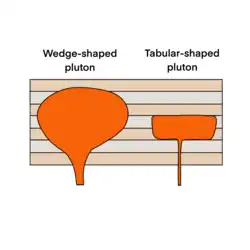 Les plutons peuvent être catégorisés en deux types selon leur géométrie dans le sol. On distingue les plutons en forme de coin et les plutons en forme de comprimé[26]. Les plutons en forme de coin ont généralement des formes irrégulières. Ils peuvent avoir des racines qui se rétrécissent vers le bas et qui finissent par devenir des structures nourricières de forme cylindrique qui font plonger les sols vers l'intérieur sous différents angles[24]. Les plutons en forme de comprimé ont des dalles et des toits parallèles et des côtés plus raides que les plutons en forme de coin[1]. Certains plutons peuvent présenter des caractéristiques des deux types[1].