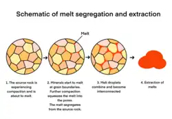 La ségrégation par fusion est le processus de séparation de la masse fondue de sa roche mère. Après avoir été générée par fusion partielle, la masse fondue riche en silice est séparée de la roche mère par le biais d'un compactage gravitationnel[8]. Cela compresse la matière fondue à travers les pores et les matières fondues sont produites aux joints de grains[8]. Lorsque les gouttelettes de matière fondue continuent de s'accumuler et que la proportion de matière fondue continue d'augmenter, elles ont tendance à se rassembler sous forme de flaques de fonte[9]. L'interconnectivité de la matière fondue joue un rôle crucial dans la détermination de la possibilité et du moment de l'extraction de la matière fondue[9]. Lorsque le pourcentage de fusion dans la roche mère atteint environ 7 %, la migration de la fusion commence[10]. À ce stade, environ 80 % des joints de grains sont fondus, ce qui rend la roche très fragile[10]. À mesure que le processus de fusion progresse et que la matière fondue continue à s'accumuler, elle atteint le deuxième seuil de percolation lorsque le pourcentage de matière fondue atteint environ 26 % à 30 %[11]. À ce stade, la matrice de la roche mère commencera à se décomposer, et la masse fondue commencera à être extraite[5].