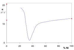 Cependant, on peut repousser cette température en changeant la composition chimique de l'alliage. L'alliage nickel-fer à 50 % de nickel présente une température de Curie de 565 °C, ce seuil évoluant avec la teneur en nickel. Au-delà de 600 °C, aucun alliage de fer-nickel connu ne conserve son effet Invar : le quartz, avec un coefficient de dilatation thermique de 0,5 × 10−6 K−1 jusqu'à 300 °C, est alors souvent utilisé.