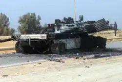- ↑ Une division mécanisée de l'armée régulière irakienne « type 2003 », équipée en moyenne d'environ 40 chars moyens T-54 totalement obsolètes (canon à âme rayée de 100 mm, ne tirant pas de munition flèche (OFL), tirant des obus perforants (OP) et des obus à charge creuse (OCC) ne perçant plus la plus grande partie des surfaces blindées des chars lourds de la coalition, néanmoins capable d'affronter avec succès des véhicules de combat d'infanterie (VCI) de type Bradley ou Warrior et très dangereux pour les véhicules faiblement blindés, mais dont un obus quelconque n'a de chance raisonnable d'atteindre une cible en mouvement lent qu'à moins de 1 000 m), d'environ 120 (VTT) MT-LB (véhicule de transport de troupes dont l’armement principal se limite à un fusil mitrailleur de 7,62 mm), disposant de l'équivalent d'une compagnie d'éclairage montée sur véhicules légers, d'une compagnie de missiles anti-char (équipée d'un petit nombre de missiles antichar AT-3 Sagger portatifs, demandant un très grand entraînement des servants pour avoir une probabilité raisonnable d'atteindre son but, ne percent plus la plus grande partie des surfaces blindées des chars lourds de la coalition, mais restent efficaces contre les véhicules de combat d'infanterie (VCI) de type Bradley ou Warrior et dangereux contre des véhicules faiblement blindés), de deux batteries d'artillerie (canons tractés D-20 et/ou D-30) et d'un petit nombre de véhicules de transport ne permettant pas, et de loin, de déplacer l'ensemble de la « division » en une seule fois, était équivalente à un régiment d’infanterie mécanisée équipé d'AMX-30 B2 (tirant des munitions flèche OFL de 105 mm sur objectif mobile) et de véhicules de combat d'infanterie (VCI) AMX-10 P armés d'un canon de 20 mm et ce, uniquement en combat rapproché car, à moyenne distance (1 000-2 000 m), elle n'avait guère plus de valeur qu'un escadron d’AMX-30 B2 (tirant des munitions flèche OFL de 105 mm sur objectif mobile) et, à grande distance (2 000-3 000 m), elle devait équivaloir à un Peloton de chars lourds de combat Leclerc (tirant en marche des munitions OFL de 120 mm sur objectif mobile)… Une « division » mécanisée de l'armée régulière irakienne ne pouvait valablement se battre qu'en zones urbaines ou semi-urbaines.