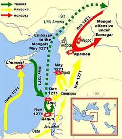 Pour leur part, les Mongols de l'Ilkhanat ont cherché, en vain, à s'allier avec les puissances européennes[12]. Par contre, ils réussissent à former une alliance byzantino-mongole avec l'Empire Byzantin