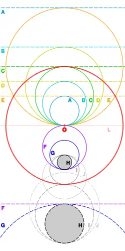 Exemples d'inversion des cercles A à J par rapport au cercle rouge en O. Les cercles A à F, qui passent par O, correspondent à des droites. Cercles G à J, qui ne correspondent pas à d'autres cercles. Le cercle de référence et la ligne L correspondent à eux-mêmes. Les cercles coupent leurs inverses, le cas échéant, sur le cercle de référence.