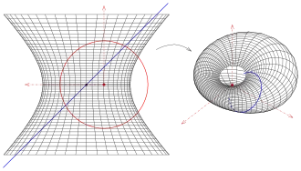 Un hyperboloïde à une nappe, qui est une surface de révolution contenant un faisceau de cercles qui est projeté sur un faisceau de cercles. Un hyperboloïde à une nappe contient deux faisceaux de lignes supplémentaires, qui sont projetés sur des faisceaux de cercles. L'image montre une telle ligne (bleue) et son inversion.