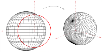 Une projection stéréographique projette généralement une sphère à partir d'un point (pôle nord) de la sphère sur le plan tangent au point opposé (pôle Sud). Cette cartographie peut être réalisée par une inversion de la sphère sur son plan tangent. Si la sphère (à projeter) a pour équation (écrit alternativement  ; de centre , de rayon , en vert sur l'image), alors il sera projeté par l'inversion par rapport à la sphère unité (rouge) sur le plan tangent au point . Les droites passant par le centre d'inversion (point ) sont projetés sur eux-mêmes. Ce sont les lignes de projection de la projection stéréographique.