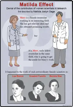 Dans le domaine scientifique, la minimisation ou la dissimulation des recherches et des découvertes menées par des chercheuses[97], connue sous le nom d'« effet Matilda », est un cas de cryptogynie. Il désigne le déni, la spoliation ou la minimisation récurrente et systémique de la contribution des femmes à la recherche scientifique, dont le travail est souvent attribué à leurs collègues masculins.