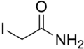 L'iodoacétamide (IAA) est un composé organo-iodé de formule brute C2H4INO. C'est un agent alkylant utilisé dans la cartographie des peptides. Son action est semblable à celle de l'acide iodoacétique. Il est communément utilisé pour se lier de façon covalente avec le groupe thiol de la cystéine afin que cette protéine ne forme pas de liaison disulfure[6],[7]. Il est aussi utilisé dans les études sur l'ubiquitine comme inhibiteur des désubiquitinases (DUB) car il alkyle les résidus de cystéine sur le site actif des DUB. L'iodoacétamide peut également induire une gastrite légère et est utilisé dans les modèles de sensibilisation gastrique chronique (iodoacétamide 0.1% dans l'eau de boisson du rongeur durant 7 jours)[8]. Comme beaucoup d'autres agents alkylants, l'iodacétamide est très toxique. Sur les souris de laboratoire, il a été montré qu'il peut provoquer des tumeurs de la peau et affecter négativement leur reproduction.