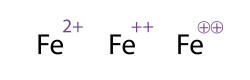 Le signe et la valeur de cette charge électrique sont indiqués en exposant à la fin de la formule chimique de l'ion, en multiple de la charge élémentaire e (quand l'ion ne porte qu'une charge, on n'indique que le signe). Exemples : Cu2+ représente l'ion cuivre (II) de charge 2e, Na+ l'ion sodium de charge e, Cl− l'ion chlore de charge −e.