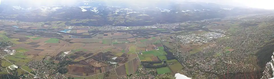 L'Isère dans la combe de Savoie depuis le massif de la Chartreuse. | |