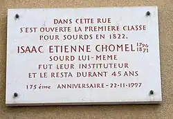 Isaac-Etienne Chomel est né le à Genève[1] au Suisse. Il étudie à l'Institut Impérial des Sourds-Muets de Paris dirigé par l'abbé Sicard[2]. Isaac-Etienne a créé une classe pour les sourds en mixte en 1822 à Genève puis il a été directeur de la première école des sourds du canton de Genève de 1836 à 1867[2].