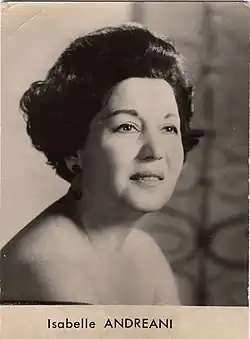 Isabelle Andreani, née le et morte le , est une chanteuse lyrique mezzo-soprano française[1]. Elle est artiste de la troupe de l'Opéra de Paris au milieu des années 1950 puis titulaire de la Carmen de Georges Bizet en 1960, rôle qu’elle a marqué par son interprétation. Retirée de la scène dans les années 1970, elle devient ensuite professeure de chant.
