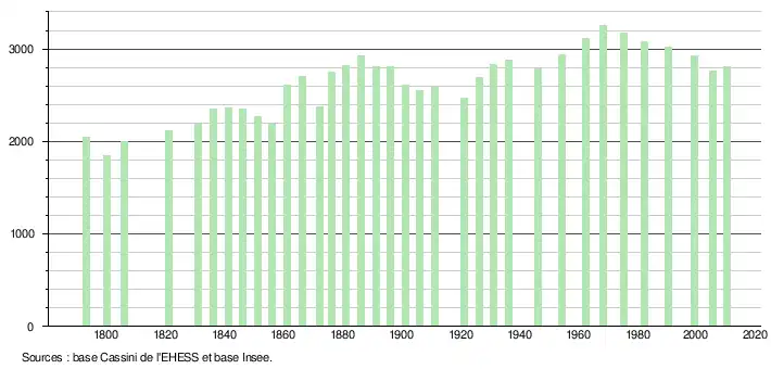 L'évolution du nombre d'habitants est connue à travers les recensements de la population effectués dans la commune depuis 1793. À partir du , les populations légales des communes sont publiées annuellement dans le cadre d'un recensement qui repose désormais sur une collecte d'information annuelle, concernant successivement tous les territoires communaux au cours d'une période de cinq ans. Pour les communes de moins de 10 000 habitants, une enquête de recensement portant sur toute la population est réalisée tous les cinq ans, les populations légales des années intermédiaires étant quant à elles estimées par interpolation ou extrapolation[5]. Pour la commune, le premier recensement exhaustif entrant dans le cadre du nouveau dispositif a été réalisé en 2005[6],[Note 2].