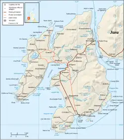 Islay mesure 40 km de long, dans une direction nord-sud, sur 24 km de large. La côte orientale de l'île, le long du Sound of Islay, est montagneuse, avec son point culminant, le Beinn Bheigier, un marilyn de 491 m d'altitude. Les péninsules de l'ouest sont séparées du reste de l'île par deux bras de mer : le Loch Indaal au sud et le Loch Gruinart au nord[1]. La péninsule du sud-ouest, constituée de terres fertiles balayées par les vents, porte le nom des Rhinns, tandis que la péninsule du nord-ouest s'achève sur le promontoire d'Ardnave Point. La côte sud, protégée des vents dominants, est partiellement boisée[2],[3]. Le littoral fractal abrite de nombreuses baies et lochs marins, parmi lesquels le Loch an t-Sailein, la baie d'Aros et la baie de Claggain. À l'extrémité sud-ouest de l'île se trouve une péninsule rocheuse, The Oa, qui constitue le point des Hébrides le plus proche de l'Irlande[4].