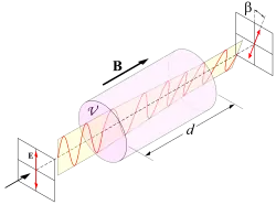 L'électron n'oscille plus parallèlement au champ électrique mais avec un angle qui dépend entre autres de l'amplitude du champ magnétique. L'onde réémise par rayonnement des dipôles induits est, elle, polarisée selon l'axe d'oscillation des dipôles: la polarisation a tourné d'un angle (par exemple, ).