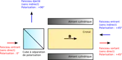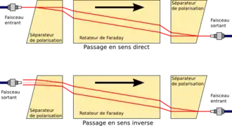 Le composant principal d'un isolateur optique est le rotateur de Faraday. Le champ magnétique appliqué au rotateur de Faraday implique une rotation de la polarisation due à l'effet Faraday. L'angle de rotation, est donné par la relation: