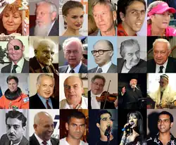 24 israéliens célèbres, de gauche à droite et de haut en bas, respectivement : Ada Yonath, Robert Aumann, Natalie Portman, Amos Oz, Yossi Benayoun, Shahar Peer, Moshe Dayan, David Ben Gourion, Yitzhak Rabin, Menahem Begin, Golda Meir, Ariel Sharon, Ilan Ramon, Benyamin Netanyahou, Natan Sharansky, Itzhak Perlman, Israel Meir Lau, Ovadia Yosef.