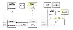 Diagrammes UML de classe et de séquence du pattern itérateur.