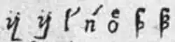 | Sylvester | ā | ćz (cz) (c[α]) | cz | ę ê (é) | ǵ (g[α]) | g (gh[α]) | i | i[β] | y[γ] | ii̢ | ij | l’ | ń | o | oͤ | ſ s | ſↄ[δ] | ß | t’ | u[6] | u[β] | w[γ] | uͤ |