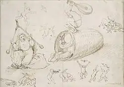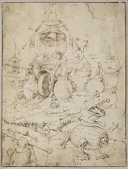 ↑ La citation est reprise d'une phrase latine inscrite par Jérôme Bosch sur un autre dessin conservé au Kupferstichkabinett Berlin: «Malheureux celui qui ne fait qu'imiter et ne développe pas ses propres inventions.».