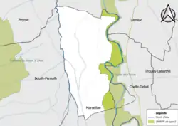 Son territoire qui a une étendue de 188 hectares est circonscrit par ceux de Marseillan, de Bouilh-Péreuilh, Peyrun, Laméac et Chelle ; il est limité à l'est par l'Arros qui coule au pied de la colline ; à l'ouest par le petit ruisseau de la Nénos qui prend naissance à Marseillan et va se joindre à l'Arros à Montégut dans le Gers.