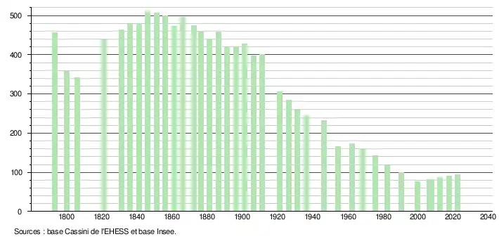 L'évolution du nombre d'habitants est connue à travers les recensements de la population effectués dans la commune depuis 1793. Pour les communes de moins de 10 000 habitants, une enquête de recensement portant sur toute la population est réalisée tous les cinq ans, les populations de référence des années intermédiaires étant quant à elles estimées par interpolation ou extrapolation[26]. Pour la commune, le premier recensement exhaustif entrant dans le cadre du nouveau dispositif a été réalisé en 2007[27].