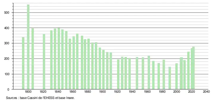 L'évolution du nombre d'habitants est connue à travers les recensements de la population effectués dans la commune depuis 1793. Pour les communes de moins de 10 000 habitants, une enquête de recensement portant sur toute la population est réalisée tous les cinq ans, les populations de référence des années intermédiaires étant quant à elles estimées par interpolation ou extrapolation[21]. Pour la commune, le premier recensement exhaustif entrant dans le cadre du nouveau dispositif a été réalisé en 2005[22].