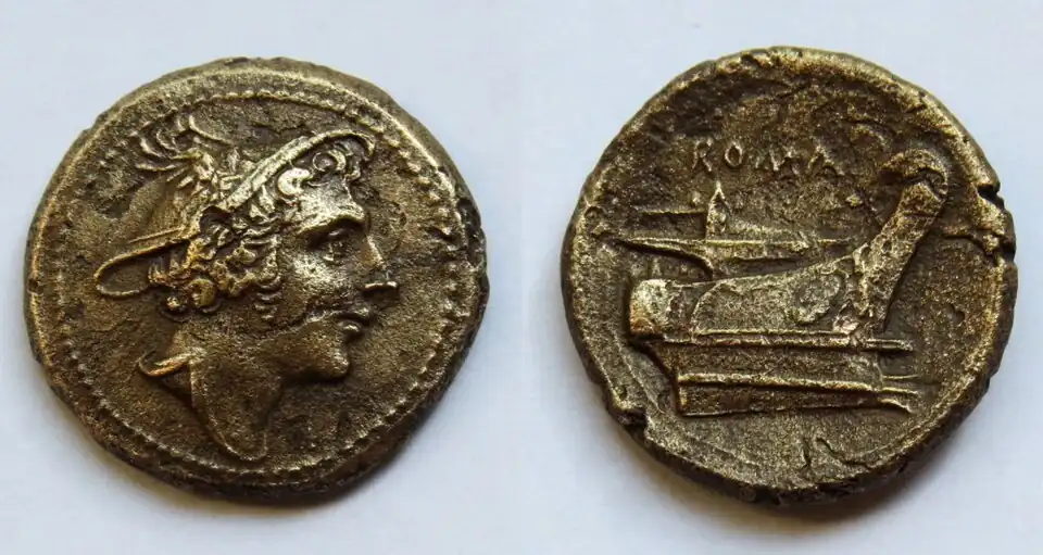 Qu'en est-il de la surprenante association entre le temps et la nef ? L'as d'airain, l'unité monétaire de Rome, est orné du Janus bifrons et d'une proue de navire. Jouer à pile ou face se dit capita aut navia? (« têtes ou nef ? »)[25]. Le navire n'est pas le seul revers de la pièce (voir illustration) ; et les autres monnaies romaines portent aussi une nef au revers (voir illustration). L'association iconologique entre le dieu et le navire est motivée par le concept de « passage » et de traversée du Tibre[26] et intimement liée à Portunus, le dieu des ports, alors que Janus est celui des portes[26]. Le Janiculum se trouve « au-delà du Tibre » par rapport au Capitole. le Tibre constituait une frontière naturelle de Rome avec l'Étrurie. De là la description ovidienne de Janus comme roi étrusque[26]. Cette association entre Janus et le passage du Tibre, explique l'érection, par Caius Duilius, d'un temple dédié à Janus, après sa victoire navale, la première que remportent les Romains, à la bataille de Mylae[26]. Ce temple a été inauguré le , le jour des Portunalia, fête de Portunus[26]. Pline note sèchement : « le poids réel de la livre de cuivre fut diminué durant la première guerre punique, la République ne pouvant faire face à ses dépenses ; et il fut décrété qu'on frapperait des as de deux onces. On gagna de la sorte cinq sixièmes, et on liquida les dettes. La marque de ces nouveaux as fut sur une face un Janus à deux faces, sur l'autre un éperon de navire. »