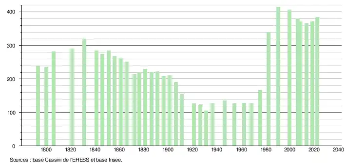 L'évolution du nombre d'habitants est connue à travers les recensements de la population effectués dans la commune depuis 1793. Pour les communes de moins de 10 000 habitants, une enquête de recensement portant sur toute la population est réalisée tous les cinq ans, les populations de référence des années intermédiaires étant quant à elles estimées par interpolation ou extrapolation[31]. Pour la commune, le premier recensement exhaustif entrant dans le cadre du nouveau dispositif a été réalisé en 2008[32].