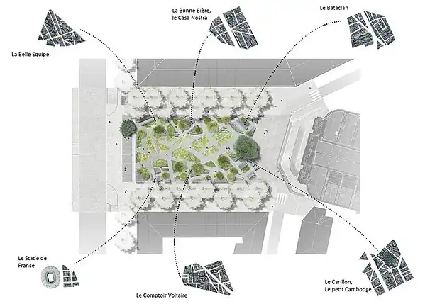 Le tracé du jardin rappelle les six lieux où se sont déroulés les événements des attentats du 13 novembre 2015, ainsi que la géographie de Paris. Les plans des six sites et des huit lieux d'attentats viennent composer le dessin du jardin et forment les allées. Symboliquement, chaque site dans ce jardin cicatrise avec les autres[5].