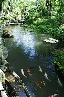 - de l'eau : mares, rivières, chutes ; dans le cas d'un lac central on y trouve souvent une île, et un pont ou des pierres de gué[l 13] menant à l'île ; les étendues d'eau contiennent fréquemment des carpes koï ; contrairement aux jardins occidentaux, on ne trouve presque jamais de fontaines ;