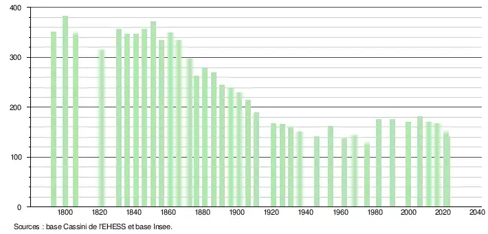 L'évolution du nombre d'habitants est connue à travers les recensements de la population effectués dans la commune depuis 1793. Pour les communes de moins de 10 000 habitants, une enquête de recensement portant sur toute la population est réalisée tous les cinq ans, les populations de référence des années intermédiaires étant quant à elles estimées par interpolation ou extrapolation[14]. Pour la commune, le premier recensement exhaustif entrant dans le cadre du nouveau dispositif a été réalisé en 2006[15].