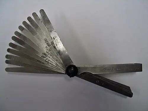 Une jauge d'épaisseur ou "Cale" est un outil ou instrument de mesure simple permettant de mesurer, ou plutôt d'estimer, l'espacement entre deux pièces mécaniques, communément appelé jeu.