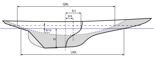 - = quarter-beam length, longueur au quart du maître-bau, le maître bau (B) étant mesuré à hauteur de la ligne de flottaison, la longueur au quart QBL étant elle-même mesurée à une hauteur de B/10 au-dessus de la flottaison. Dans la pratique, aucun architecte ne voulant pénaliser le rating, L = LWL (voir le schéma 1).