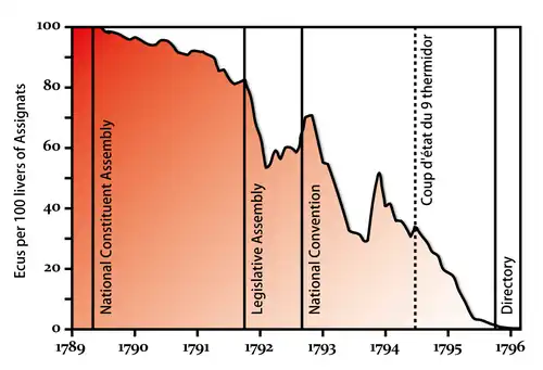 Le , c'est lui qui présente à la tribune le programme de gouvernement du Directoire. Il y fixe comme priorité la lutte contre l'agiotage[41] et la thésaurisation. Immédiatement confronté à l'inflation des assignats, qui ont commencé d'être émis en janvier, il met en place avec le ministre des finances Ramel la politique monétaire des bons d'emprunt forcé dès le , puis des mandats territoriaux gagés sur les biens nationaux hypothéqués pour finir en par la banqueroute du tiers consolidé. Il fait fixer en le cours or et argent du nouveau franc et rétablir en août la circulation des anciennes monnaies, dont le métal fait défaut à la Monnaie.