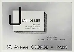 Au cours de 1955[17] après des expériences aux États-Unis où il vend sa licence à deux fabricants, il crée une ligne basée sur le système américain de confection en séries ready-to-wear et la nomme Diffusion. Les produits issus de celle-ci sont distribués dans un certain nombre de magasins en France et en Afrique du Nord. Il s'entoure d'assistants, notamment le modéliste Guy Laroche et le styliste Valentino qui commence sa carrière de couturier au sein de la maison . En 1956 Jean Dessès signe un contrat avec les Galeries Lafayette[18]et devient l'un des premiers couturiers à ouvrir une boutique dans un grand magasin pour l'exploitation des modèles de prêt-à-porter. La maison de couture en 1958 réalise un chiffre d'affaires annuel de 275 000 000 francs, emploie un personnel de 200 ouvriers. Pour réaliser une opération immobilière, Dessès abandonne les locaux de l'hôtel particulier. Lors de la démolition, alors que la maison de couture est en pleine élaboration d'une nouvelle collection, il doit déménager mais s'installe au 12 rond-point des Champs-Élysées dans l'immeuble de madame Yvonne Alexandrine Le Baron. La même année, Jean Dessès monte la Société Nouvelle Jean Dessès.