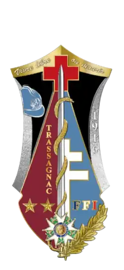 - En cœur brochant épée de médecin à la lame entourée d'une bisse d'or, à la garde chargée d'une étoile d'officier de la Légion d'honneur, le tout accompagné à dextre du nom TRASSAGNAC en lettres capitales d'or posées en pal surmontant deux étoiles du même et à senestre d'une croix de Lorraine mouvant de la lame et des lettres capitales de turquin, de candide et de gueules - FFl - posées en fasce. En pointe senestre brochant palme d'or.