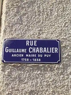 Le , à l'occasion de l'installation de la première municipalité du Puy, Jean-Guillaume Chabalier se présente au balcon de la place du Martouret en habit d'apparat et avant de laisser la place aux nouveaux élus du corps municipal appelle “à toute la reconnaissance du public pour les membres de l’auguste assemblée dont les immenses travaux préparent à la France une prospérité qui sera vraiment son ouvrage ainsi que pour le souverain monarque, Louis XVI, qui a si publiquement manifesté que le bonheur de ses sujets était la seule gloire qu’il désirait et ambitionnait.”[11]