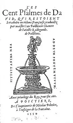 - Les cent psalmes qui restoient à traduire en rithme françoise, traduictz par maistre Ian Poictevin chantre de Saincte Radegonde de Poitiers. - Poitiers : Nicolas Peletier, 1550. 8°, [12]-313-[1] p. Les psaumes sont précédés de leur argument et de leur incipit latin. L'édition existe sous deux émissions, datées 1550 et 1551, parfaitement identiques par ailleurs. Cambridge (Mass.) HUL, Genève MHR, Paris BNF, Paris Ars., Paris Maz. Guillo 1990 n° 9.