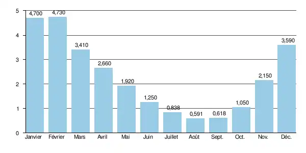 Le débit journalier maximal est de 28,30 m3/s (valeur mesurée le ) et la hauteur maximale instantanée de 203 cm le [note 2]. Le débit instantané maximal a été de 46,60 m3/s le [2].