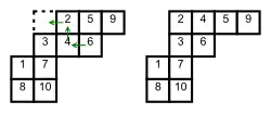 L'autre type de glissement, lorsque est dans la partie inférieure droite de , opère de la même manière, mais dans la direction opposée. Dans ce cas, on glisse un nombre dans une cellule vide depuis le voisin de gauche ou de dessus, en prenant le nombre le plus grand des nombres s'il y a un choix. Les deux types de glissements sont l'inverse l'un de l'autre : un glissement d'un des deux types peut être inversé par un glissement le l'autre type.