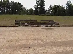 Olympie est une ville consacrée aux jeux. Pour autant, elle n'est pas déserte hors des compétitions : les sanctuaires accueillent des touristes et des pèlerins. Un personnel spécialisé (sacrificateurs, joueurs de flûte, danseurs, cuisiniers, préposés au bois) est en permanence à la disposition de ces derniers pour les sacrifices. De la main d'œuvre supplémentaire est embauchée spécialement pour les jeux[47], en particulier pour remettre en état les installations : le stade sert de pâturage ou de terre de labour hors saison ; il faut l'aménager pour les épreuves. Il faut ainsi nettoyer la ligne de départ (βαλϐίς / balbís), constituée en pierre, légèrement surélevée et creusée de deux sillons pour caler la pointe des pieds[48]. Le dispositif de départ à proprement parler (ὕσπληγξ / húsplêgx, cf. Hýsplex) est une sorte de barrière en corde abaissée au moment du signal du départ ; son installation est temporaire[49]. La bálbis sert probablement aussi de planche pour le saut en longueur et de base pour les lancers, disque et javelot[50]. Le stade comporte également à chaque extrémité un poteau unique autour duquel les coureurs doivent tourner dans les courses longues. Au nord, une tribune rectangulaire en pierre accueille les hellanodices[51]. À l'ouest, un tunnel voûté, que Pausanias appelle l'« entrée cachée » (κρυπτὴ ἔσοδος / kruptề ésodos)[52], permet aux athlètes d'entrer dans le stade. La piste à proprement parler est retournée, arrosée puis damée à l'aide de rouleaux compresseurs, avant d'être blanchie à la chaux. La piste du saut en longueur est également ameublie. L'hippodrome se trouve dans une zone qui n'a pas été fouillée ; on ignore tout de cette installation, y compris sa longueur et sa largeur[53].